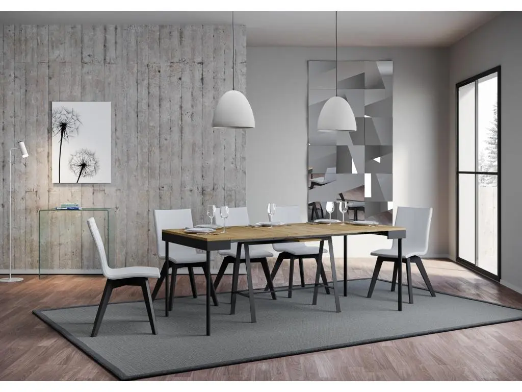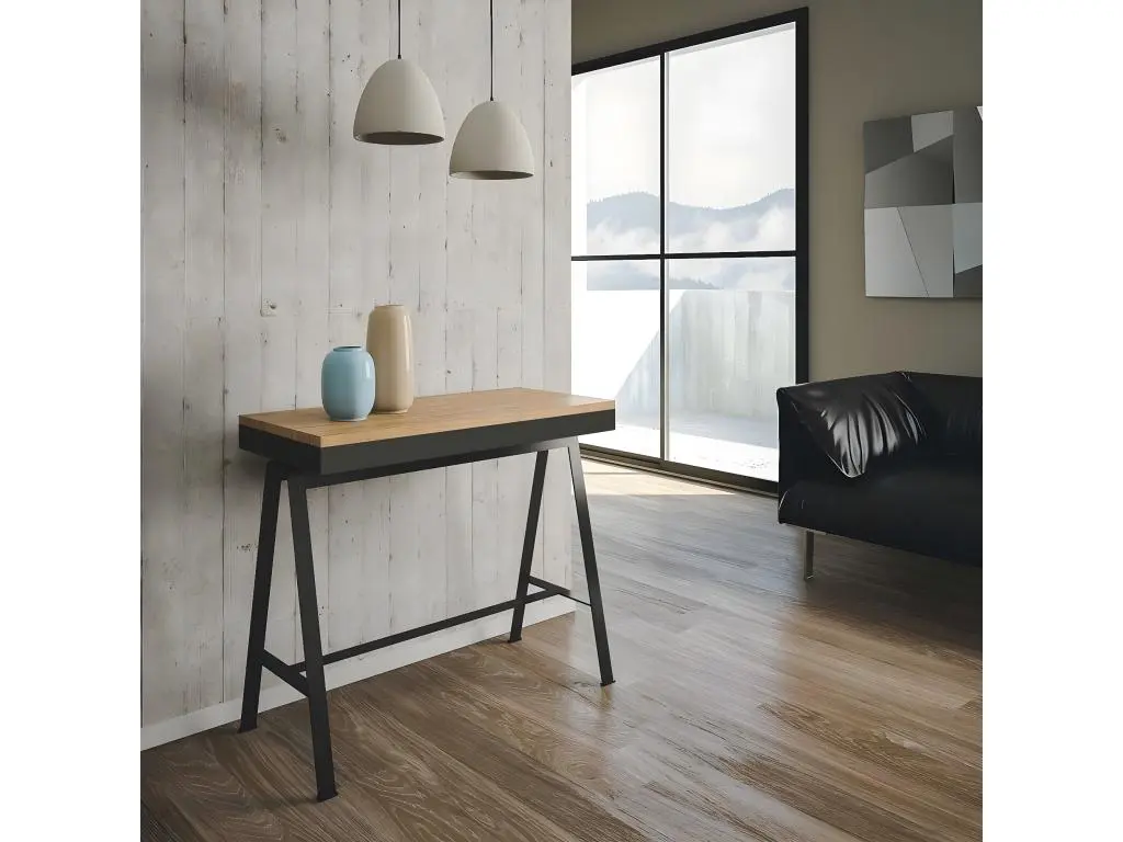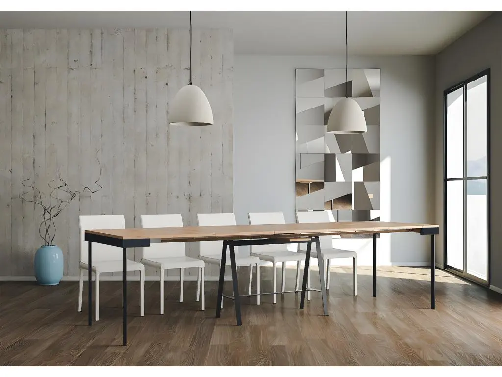 Console extensible Banco Evolution, polyvalente et robuste, un complément parfait pour chaque pièce de la maison : entrée, cuisine, salle à manger, salon ou couloir. La console extensible Banco Evolution peut être facilement transformée en une grande table à manger pouvant atteindre 300 cm de longueur, pouvant accueillir jusqu'à 14 personnes. Realisée avec des panneaux en mélaminé, cadre et pieds en fer. Le système d'extensions avec des guides télescopiques en aluminium et les supports lateraux inclus rendent la console stable et robuste. Une fois que la console est fermée, les extensions doivent être rangées ailleurs. Produit Itamoby Made in Italy Dimensions: Console fermée: L.90 P.40 H.77 cm Longueur avec 1 extension: 92 cm Longueur avec 2 extensions: 144 cm Longueur avec 3 extensions: 196 cm Longueur avec 4 extensions: 248 cm Longueur avec 5 extensions: 300 cm