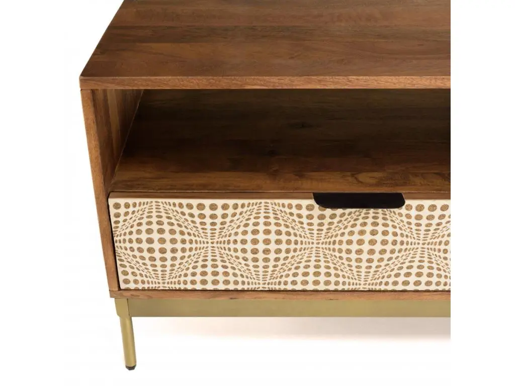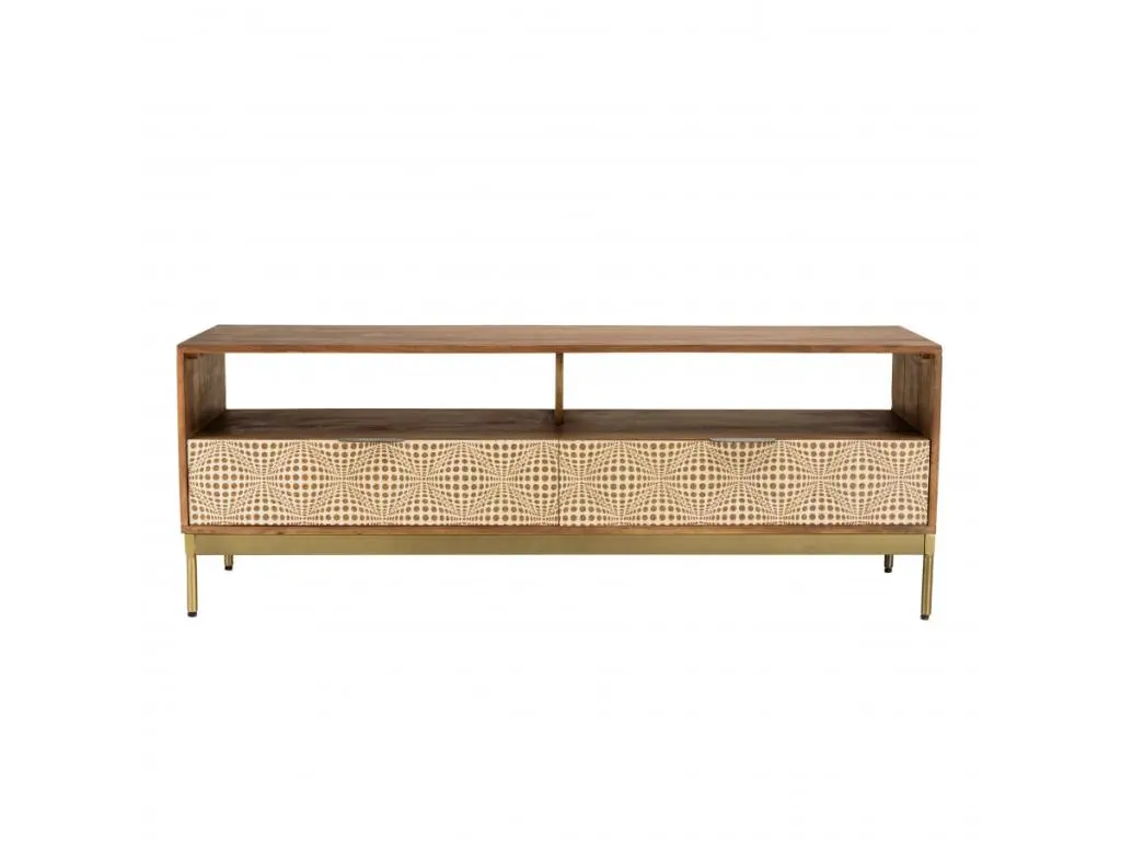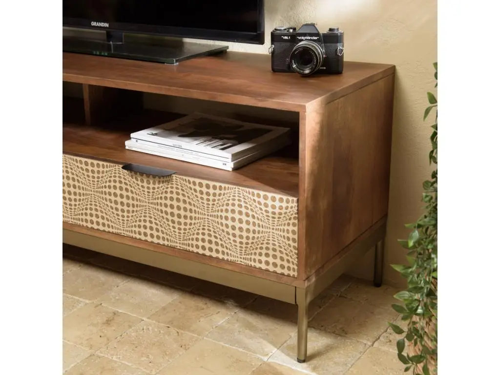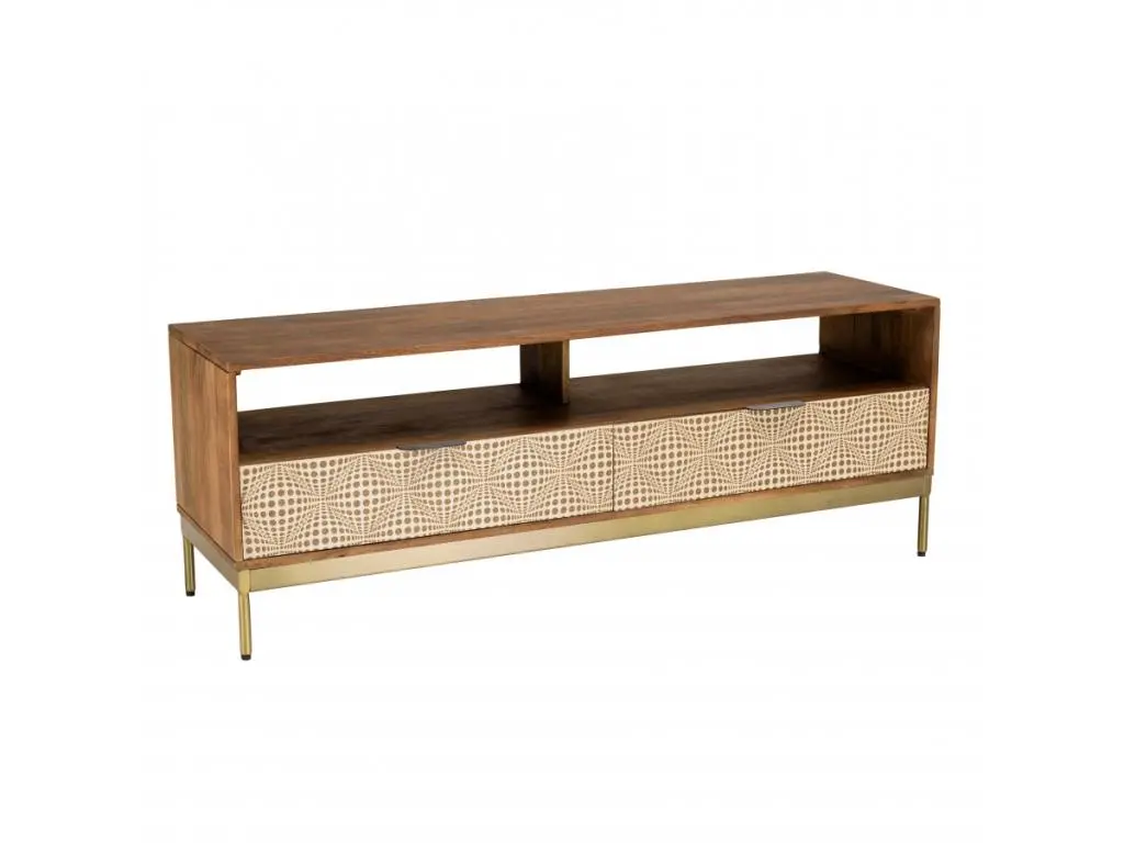 Meuble TV en bois de manguier 2 niches 2 tiroirs. Dimensions : 140 x 40 x 51 cm. Article en Manguier/Acier/MDF.